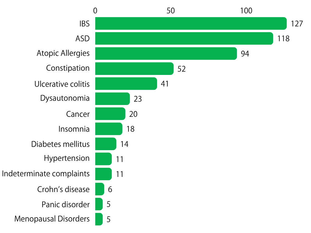 The number of actual fecal microbiota transplants by case in our study group is as follows Case reports by disease You can view case reports by disease from the links below: [Ulcerative Colitis]https://fmt-japan.org/research-activities/fmt-cases-index?tag=uc [Irritable Bowel Syndrome]https://fmt-japan.org/research-activities/fmt-cases-index?tag=ibs [Atopic Allergies]https://fmt-japan.org/research-activities/fmt-cases-index?tag=allergy [Constipation]https://fmt-japan.org/research-activities/fmt-cases-index?tag=constipation [ASD (Autism Spectrum Disorder)]https://fmt-japan.org/research-activities/fmt-cases-index?tag=asd [Other Diseases]https://fmt-japan.org/research-activities/fmt-cases-index?tag=others